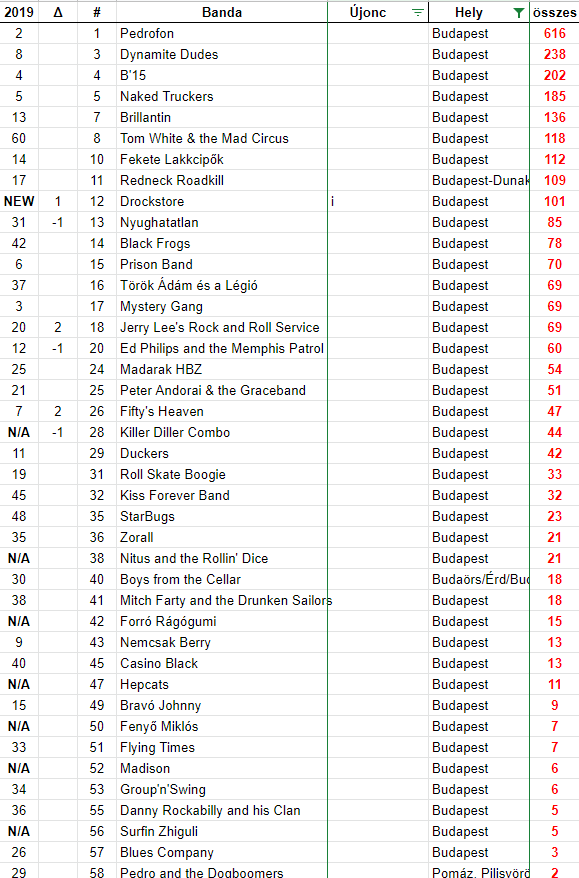 Először nézzük a budapesti, vagy budapesti kötődésű zenekarokat. Mivel ahogy az élet annyi más területén, úgy a Rock and Roll és Rockabilly zenekarokat tekintve is Budapesti túlsúly érezhető, így ez a lista nagyrészt megegyezik az összesítéssel. Élen a Pedrofon, őket a Dynamite Dudes és a B'15 követi.