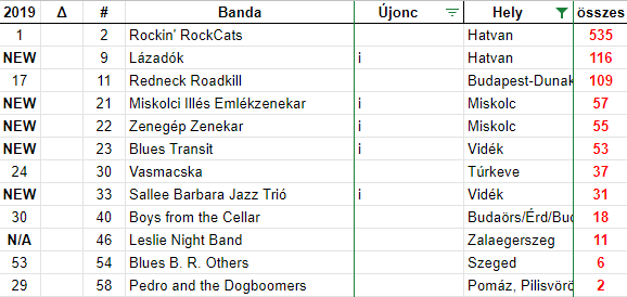 Itt nem az számít újoncnak, akik frissen alapítottak zenekart, hanem akik először kerültek be a Napi Rock and Roll megtekintési listáira. Ezt a listát a már említett Lázadók vezeti. Őket a Drockstore és a Miskolci Illés Emékzenekar követi. Hét névvel találkozunk a felsorolásban.