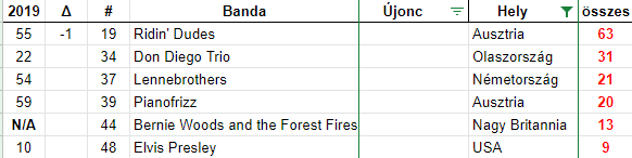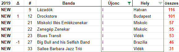az első negyvenben csupán egy zenekar van, akik idén tűntek fel: A Lázadók a 36. helyen debütáltak.
