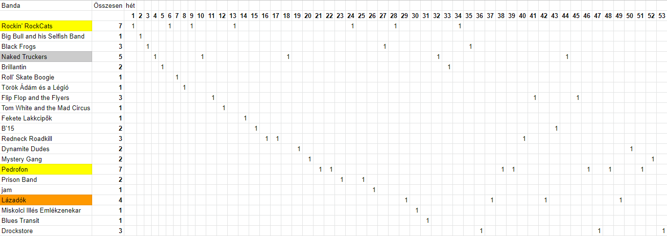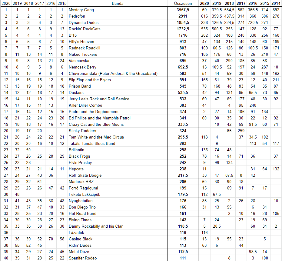Ebben a listában a zenekarok által az évek során gyűjtött pontok kerülnek összesítésre. Habár idén nem szereplet annyira jól, de így is a Mystery Gang számít a legnépszerűbbnek. Ahogy az elmúlt években, most is a Pedrofon a második. A harmadik Dynamite Dudes előnye lecsökkent a nagyot hajrázó Rockin' RockCats mögött.