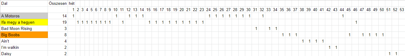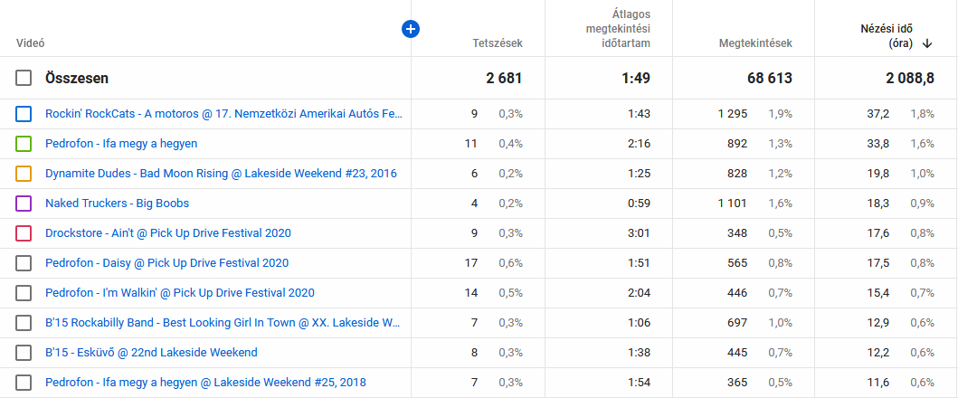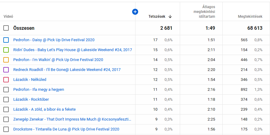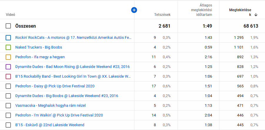 A Rockin' RockCats Motorosát több, mint 37 órán át nézték a rajongók. Ez valamivel több, mint másfél nap. Az Ifa megy a hegyen sem maradt el sokkal a másfél naptól. Az előadó, mint azt mindenki jól tudja a Pedrofon. A Bad Moon Rising lett a harmadik ebben a kategóriában a Dynamite Dudes-tól, közel húsz órás összemegtekintéssel. Érdekesség, hogy a Pedrofon négyszer képviselteti magát az első tízben, kétszer ugyanazzal a dallal.