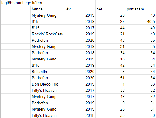 2017 óra készül a lista a zenekarokról, akik egy adott héten a legtöbb pontot szerezték azzal, hogy egynél több daluk is bejutott a heti nézettségi listára. 2019 29. hetében a Mystery Gang 43,5 pontot szerzett, őket a B'15 követi kétszer. 2019 27. hetében 40,5, míg 2017 44. hetében 40 pontot szerzett a banda.