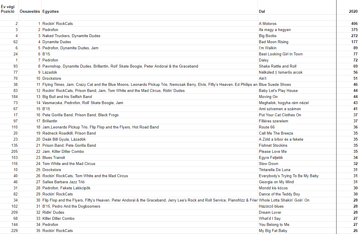 Ez a lista a Top 20 heti listán alapul, a 2020 során gyűjtött pontok összessége. Az egész év a Rockin' RockCats és a Pedrofon versengéséről szólt, itt is ez tükröződik. A Motoros 406 pontot kapott az élen, míg az Ifa megy a hegyen 375-öt. 272-vel a Big Boobs let a harmadik.