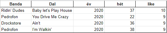 Ebben a kategóriában a dalok versengenek, függgetlenül az előadótól. Az Ifa megy a hegyen tizenkilenc héten át vezette a Top 20-as dallistát, míg a Motoros 14 héten állt az első helyen. A Big Boobs, amit két zenekar is előadott lett a harmadik nyolc héttel. Hét dal szerete meg az elsőséget a Top 20-as listán 2020-ban.