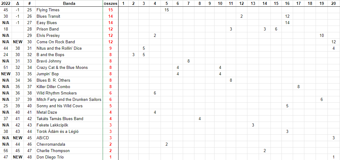 Idén szintén először szerzett pontokat a 25. AB/CD, és a 48. olasz Don Diego Trio is. A talján banda zárja jelenleg a listát.