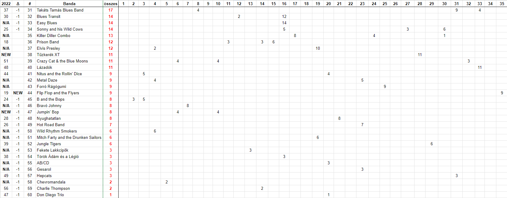 "Mexikóban", a lista második felében ketten tudtak javítani. A 21. Lonesome Carroll Rockabilly Show kéthelyet, a 28. Red Roosters hat helet ugrott előre.