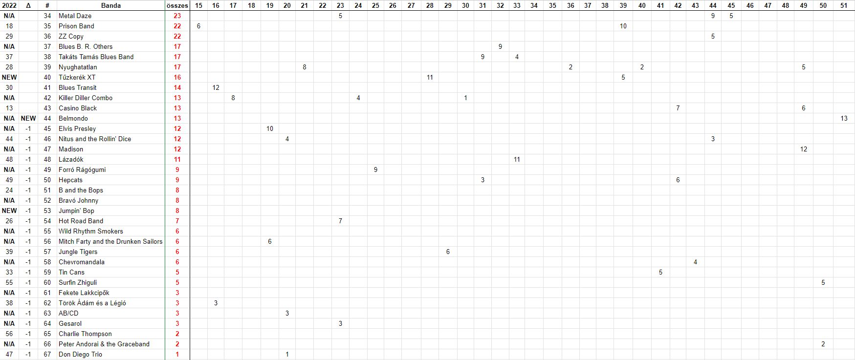 A bajnokságban idén debütált a Red Roosters, ami éppen most érte el a 16. helyet, és ezzel esélyt szerzett a Rock and Roll Kupában való indulásra. Persze csak ha az 52. héten nem csúszik vissza.