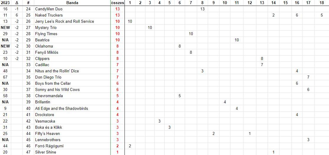A 21. Red Rosters tizenegy, a 25. Naked Truckers hat másik zenekart előzött meg.