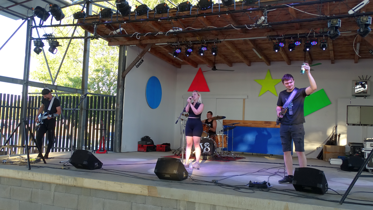 A szombat reggel is tartalmas programokkal indult, amik nagy sikernek örvendtek. Ezek után egy szokatlan látványnak lehettünk szemtanúi. A Random zenekart felpakolták a szervezők egy úszó stégre, és átvontatták a tábor másik végébe. Ők is remek műsorral készültek.