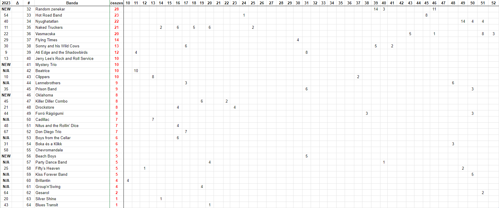 A 2024-évi bajnokságot a Blues Transit zárja a 64. helyen. Az előpzp évben 67 zenekar szerepelt a heti top 10-es megtekintési listákon, ez három darabos csökkenést jelent.